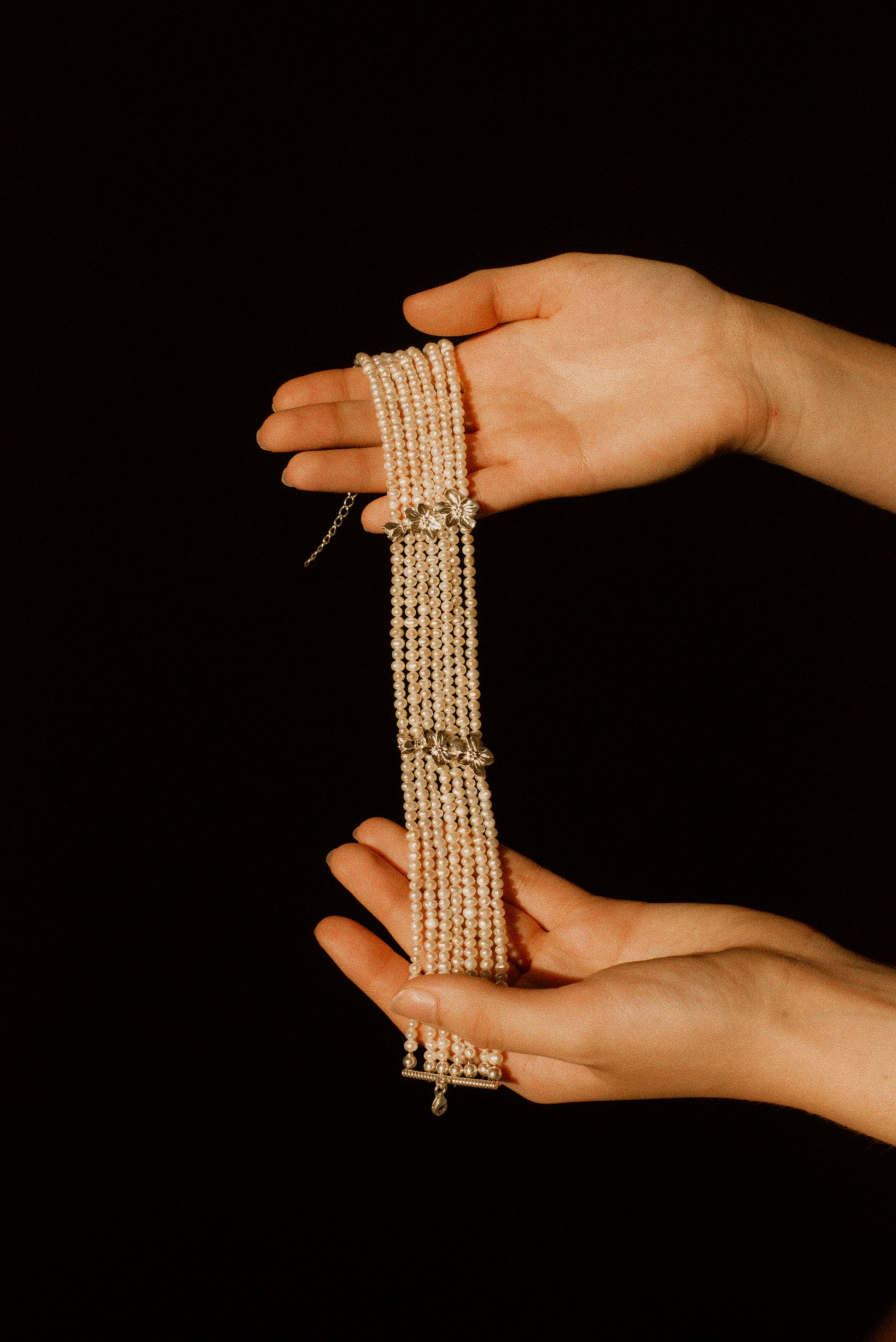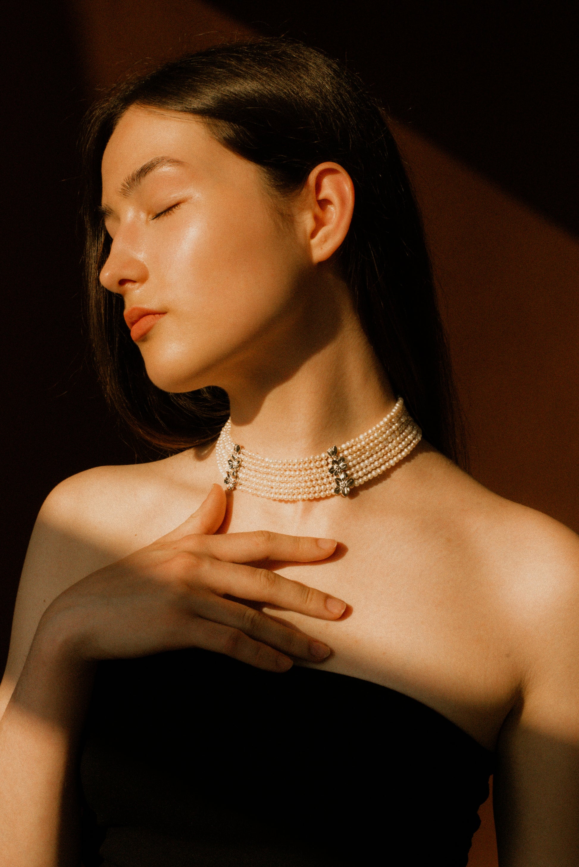 Чокер багатошаровий з натуральних перлів. Довжина чокера: 35 см + 5 см подовжувач. Матеріали: натуральні перли, срібна фурнітура з родіюванням